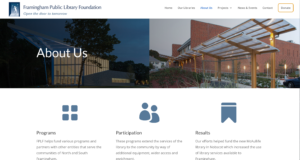 Last week Perugi.com launched a new website for the Framingham Library Foundation. The old site was also designed by Deb Perugi, but was already more than a few years old and needed a do over. Perugi uses the powerful WordPress builder Divi with built in functionality that can reduce the time and add new features to a website. The site should be seen live to be fully appreciated. Here is the link.