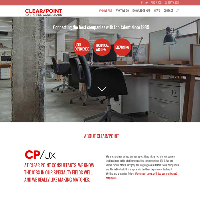 Clear/Point Consultants of Gloucester, came to Deb with a big problem. They had already spent some of their budget paying a web development company in Boston to build a site based on another designer’s vision in photoshop. Where they failed, De was able to deliver in three weeks and on budget.